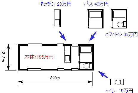 例えば、下図の仕様では、本体+キッチン+トイレ+バス=270万円 と成ります。これにロフト(6帖相当)を追加すると、295万円。タイヤは引越し以外は不要でしょう。